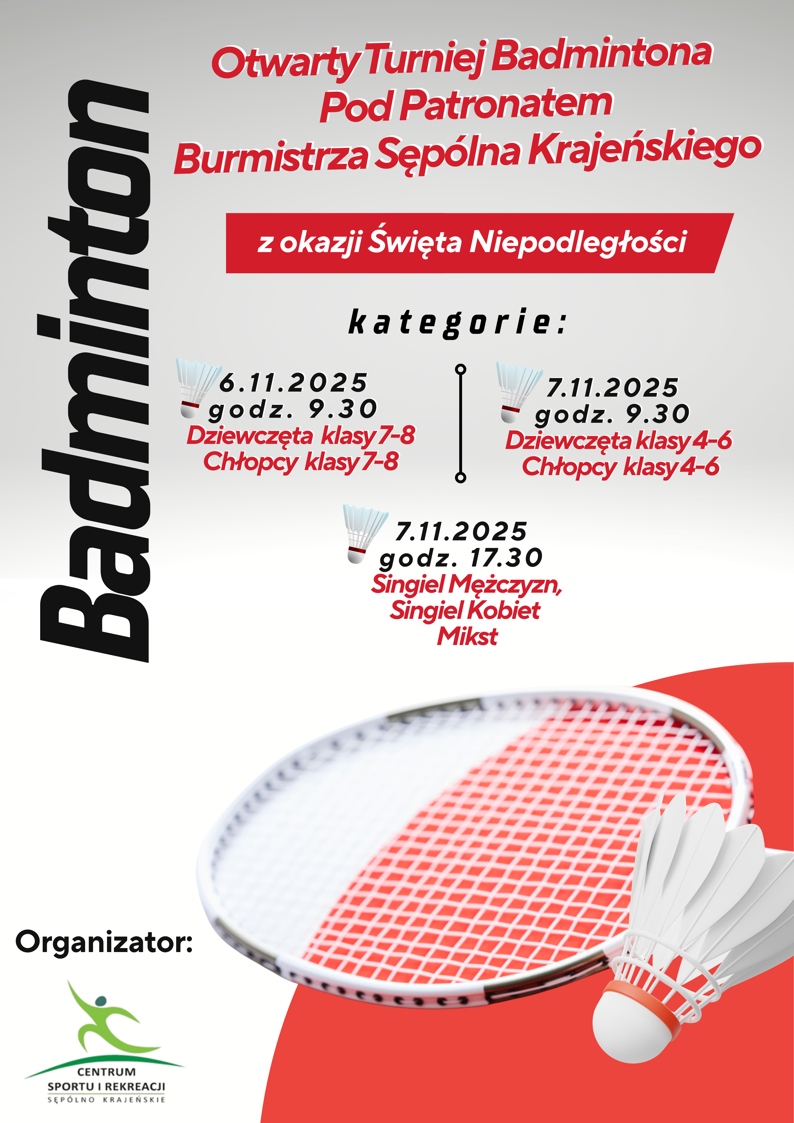 Centrum Sportu i Rekreacji zaprasza do udziału w Otwartym Turnieju Badmintona Pod Patronatem Burmistrza Sępólna Krajeńskiego z Okazji Święta Niepodległości. Zmagania odbędą się w dwóch dniach (czwartek i piątek), 6 - 7 listopada 2025r.