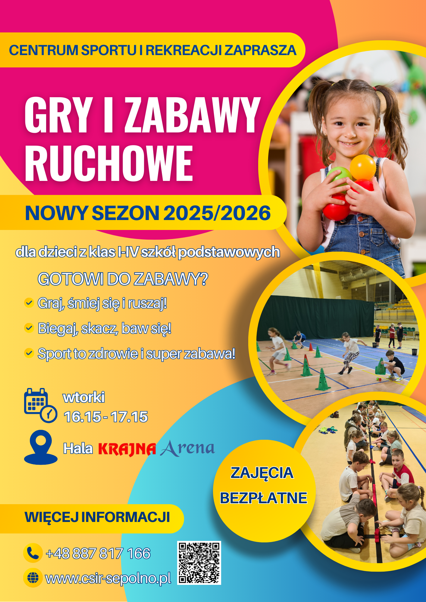 Wraca kolejna edycja GIER I ZABAW RUCHOWYCH. Zapraszamy wszystkie dzieci z klas 1-4 szkół podstawowych. Zajęcia dostosowane będą do potrzeb i możliwości uczestników. Podczas nich dzieci będą poznawały nowe gry, zabawy oraz dyscypliny sportowe. Zajęcia odbywają się w każdy wtorek w godz. 16.15 - 17.15 w hali Krajna Arena. Przed nami dużo dobrej zabawy! Udział w zajęciach jest bezpłatny. Startujemy 30 września. Szczegółowe informacje można uzyskać bezpośrednio u trenera: tel. 887-817-166. Zapraszamy!