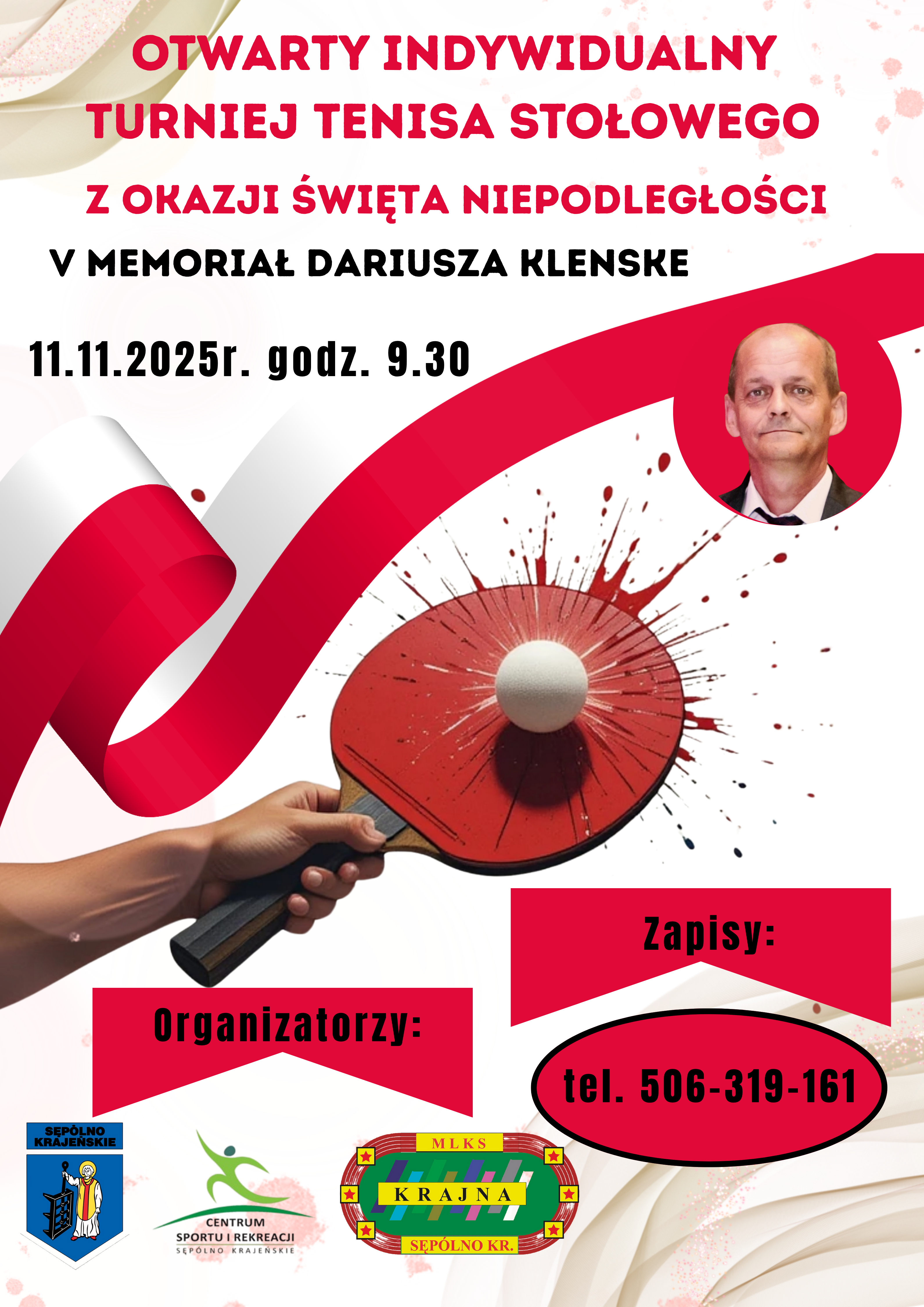 Gmina Sępólno Krajeńskie, MLKS Krajna Sępólno Krajeńskie oraz Centrum Sportu i Rekreacji w Sępólnie Krajeńskim zaprasza na kolejny Otwarty Indywidualny Turniej Tenisa Stołowego z Okazji Święta Niepodległości. Będzie to także V Memoriał Dariusza Klenske, zmarłego, wieloletniego trenera i zawodnika MLKS Krajna. Zmagania odbędą się 11 listopada 2025r. (wtorek) o godz. 9.30 w hali Krajna Arena. Zapisy przyjmowane będą telefonicznie pod numerem telefonu 506-319-161 do dnia 8 listopada 2025r. lub osobiście w dniu zawodów do godz. 9.00. Turniej przeprowadzony zostanie w 6 kategoriach: