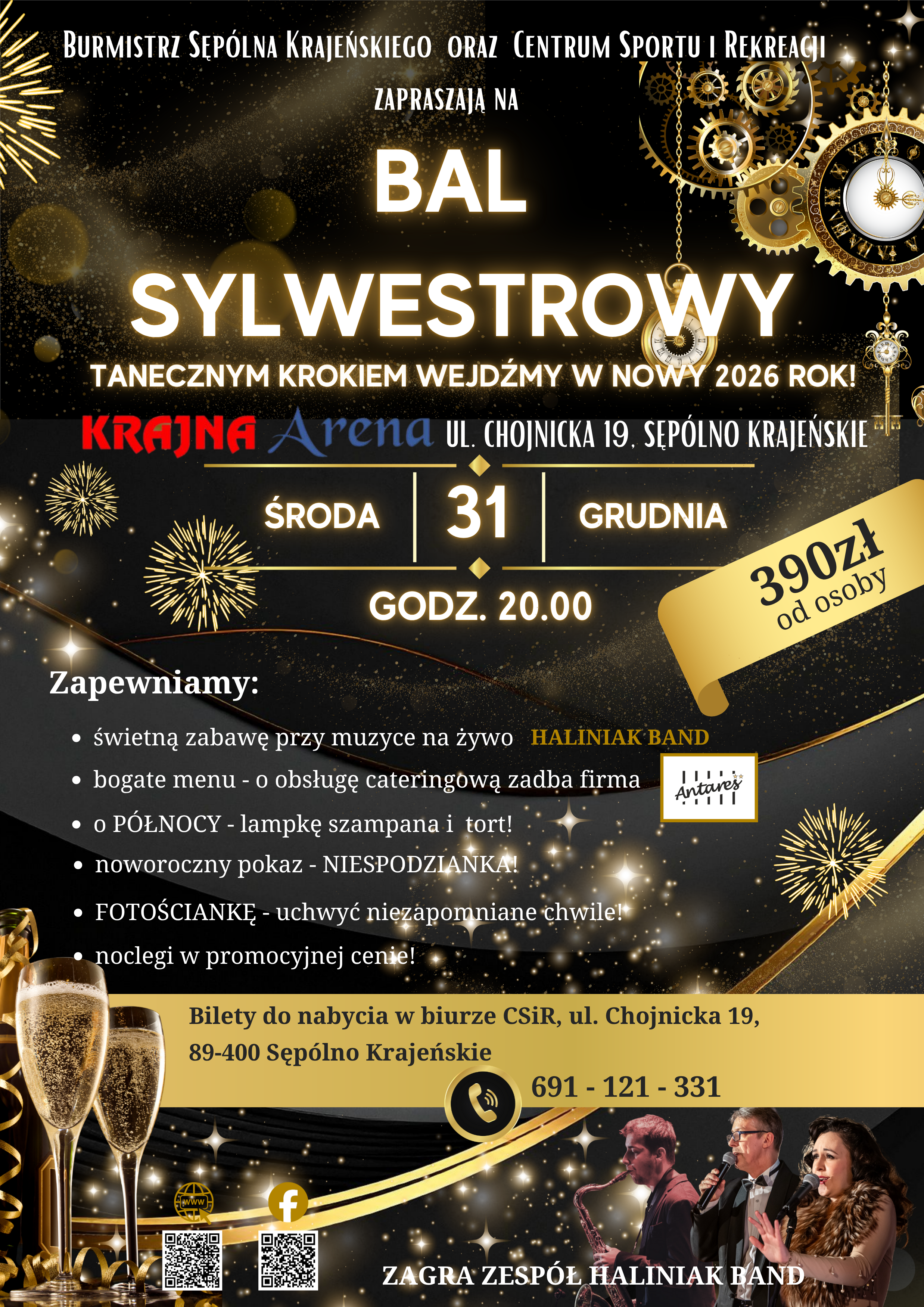 Nie przegapcie okazji, by powitać Nowy Rok w blasku i radości. Ilość miejsc ograniczona! Zarezerwujcie swój bilet już dziś i przeżyjcie niezapomniany Bal Sylwestrowy w Krajna Arena!